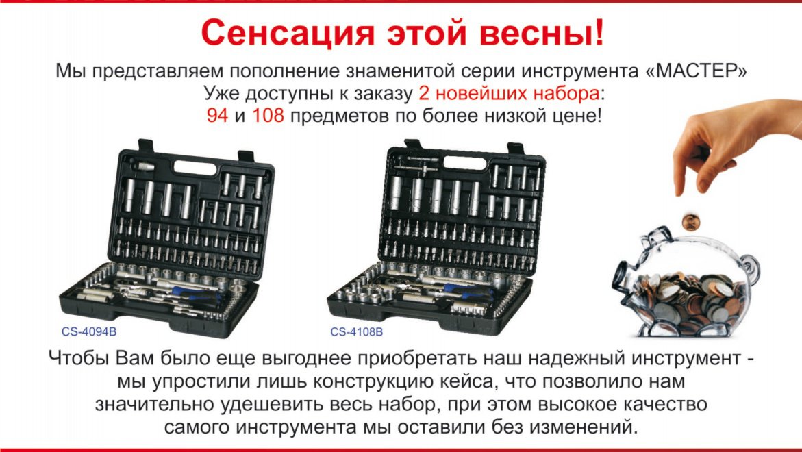Спешите приобрести наборы качественного инструмента "Станкоимпорт" CS-4108B (108 предметов) и CS-4094B (94 предмета) по специальной акционной цене.